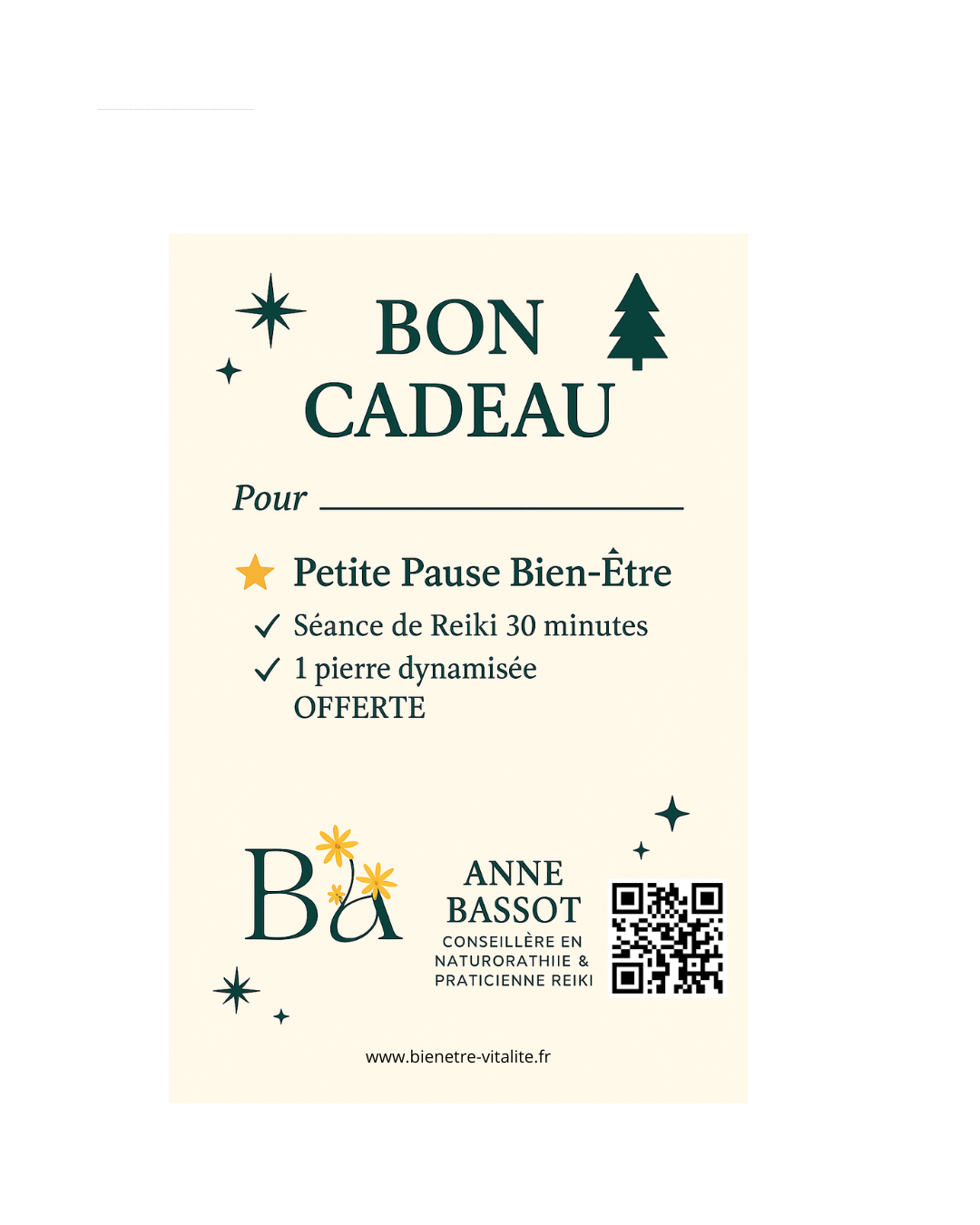 Pour les modalités (achat de bon pour un soin) , veuillez me contacter par téléphone et me laisser un message en me laissant vos coordonnées.